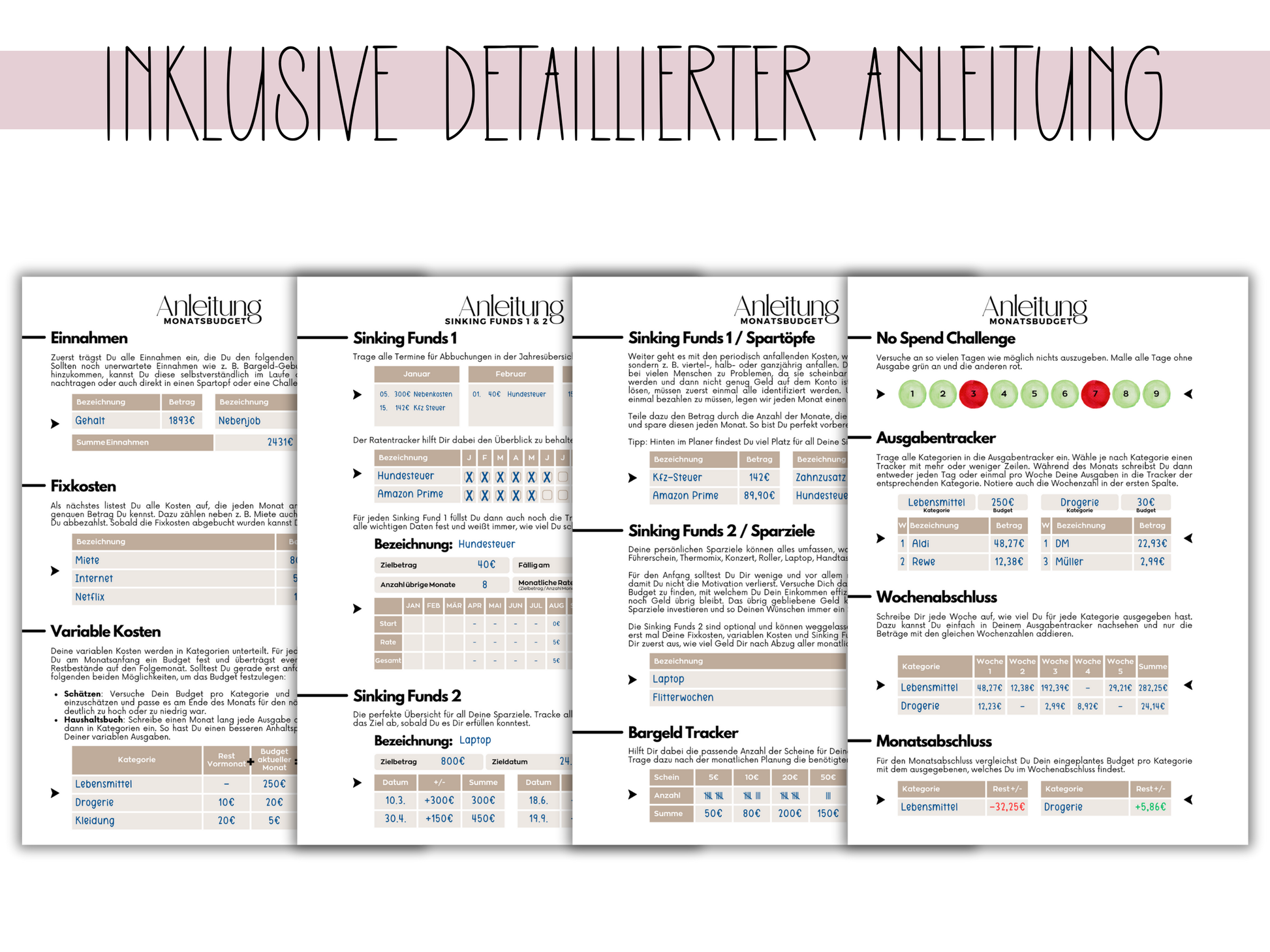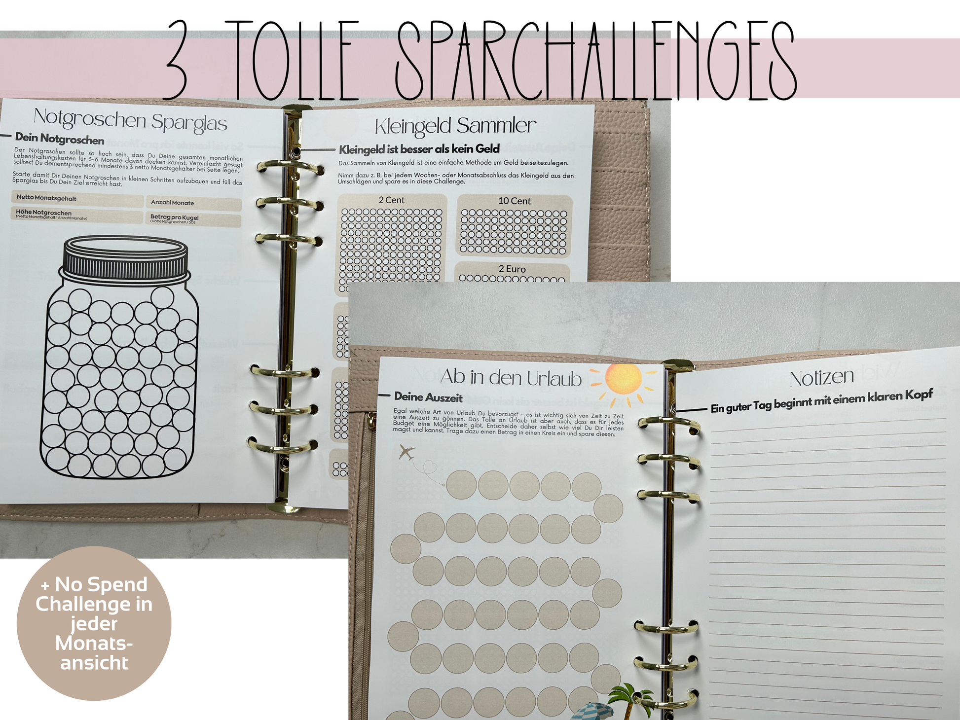Dieser Budgetplaner enthält alles was Du brauchst: Platz für Einnahmen, Ausgaben, Auswertungen + Monatsabschlüsse + Jahresabschluss + Sinking Funds 1 und Sinking Funds 2 + Kleingeld Challenge + No-Spend-Challenge usw.